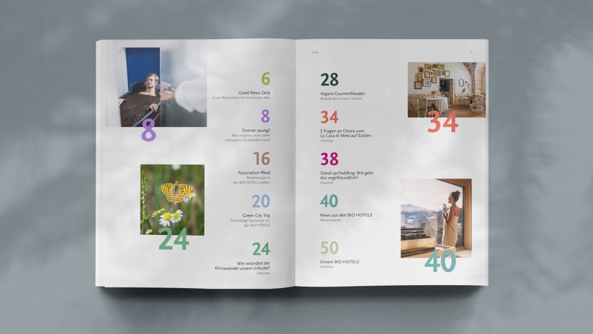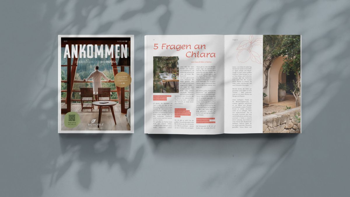 Um die Hotelbesucher während ihrer Auszeit bestmöglich übers Angebot der BIO Hotels sowie aktuelle Themen aus der Nachhaltigkeit zu informieren, wurde das Magazin «Ankommen» ins Leben gerufen und von Studio Nobu umgesetzt.