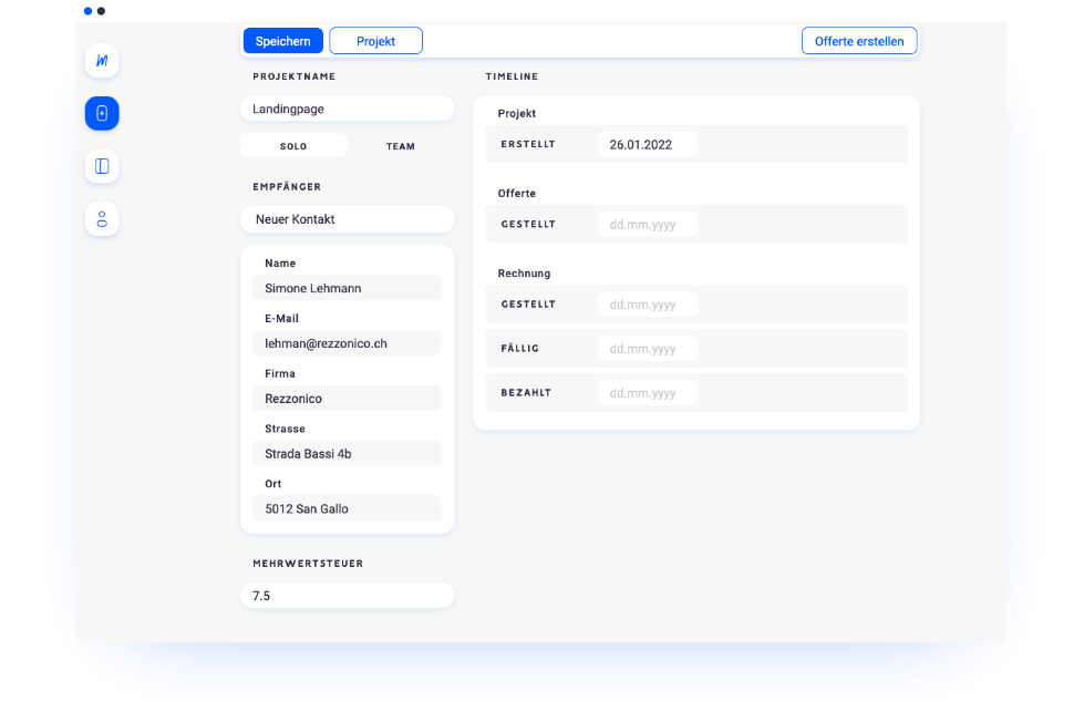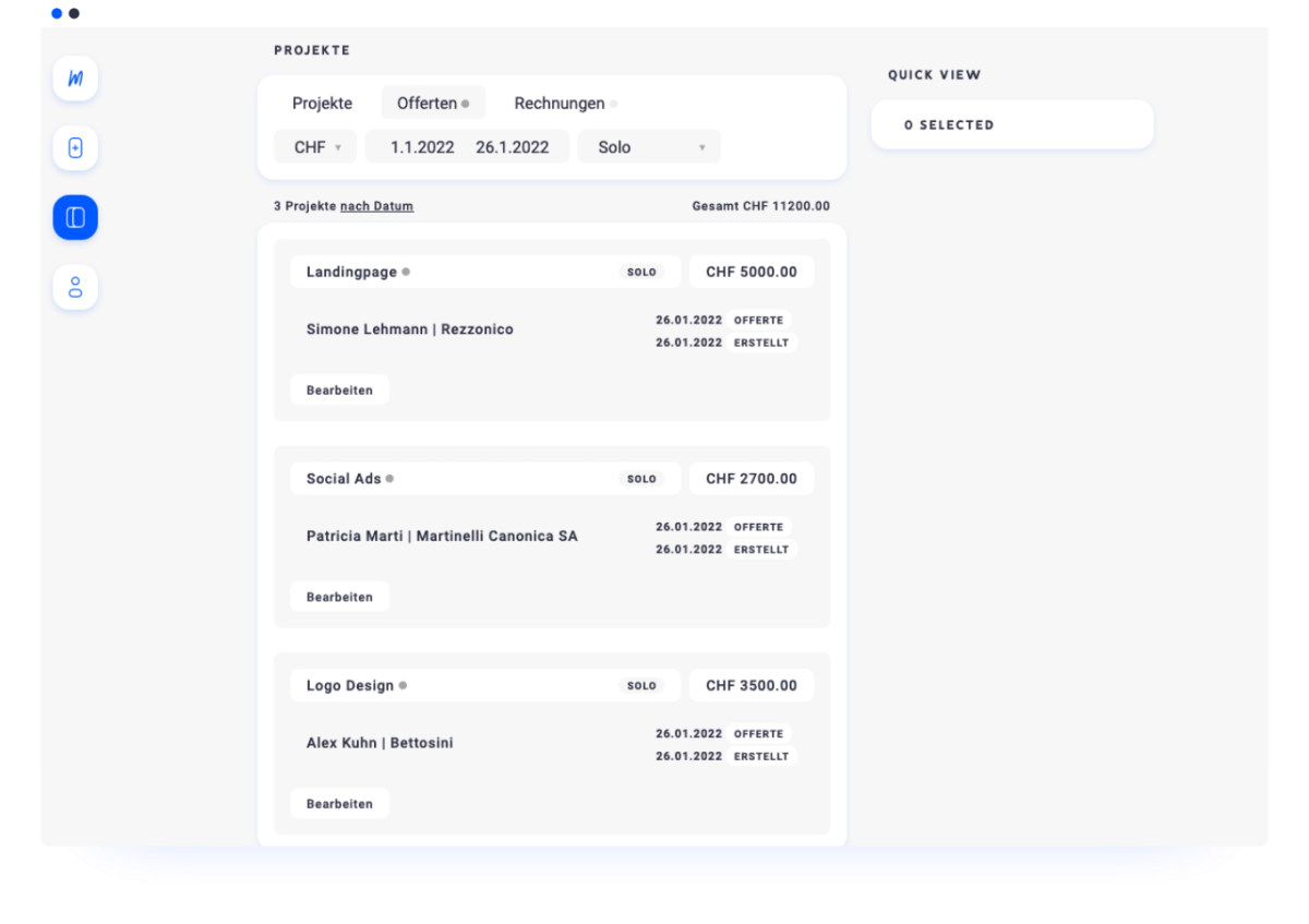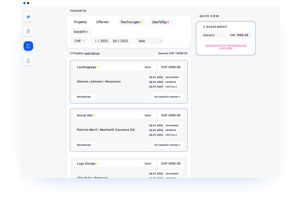 Mit Mula kannst du: Projekte erstellen, Rechnungen und Offerten ausspielen und den Zahlungsstatus überprüfen. Erstellte Projekte verwalten, sortieren und Abrechnungs-summen anzeigen lassen. Neue Kontakte anlegen und bestehende Kontakte verwalten.