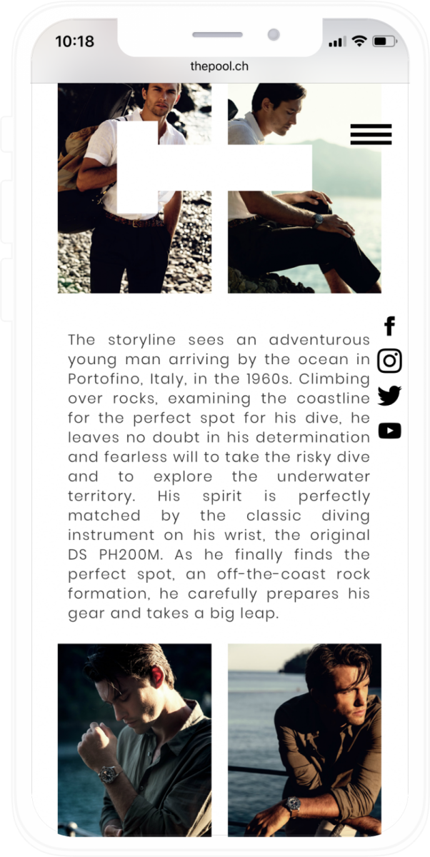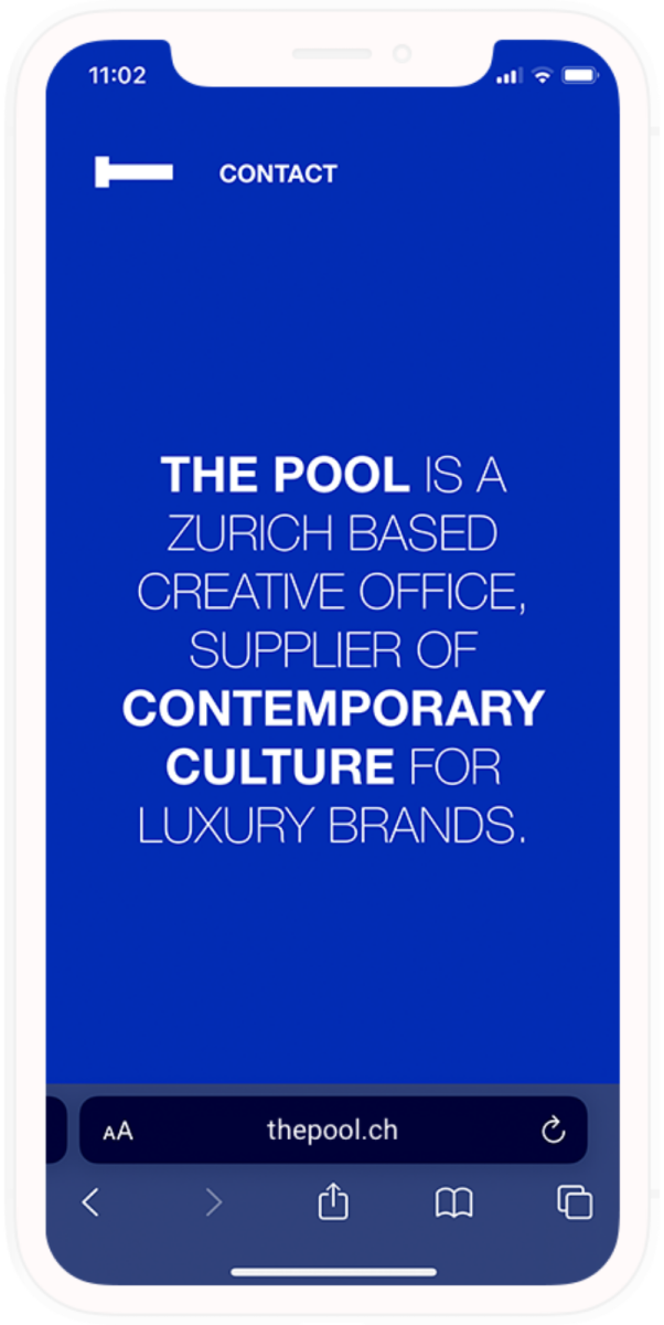 Die Zürcher Kommunikationsagentur The Pool hat uns mit dem Re-Branding und Launch ihrer Online-Plattform beauftragt. Studio Nobu erarbeitete eine flexible Publishing-Webseite, die sich optimal den jeweiligen Inhalten (Bildstrecken, Videos, Interviews) angepasst hatte. Ende 2021 wurde die Seite erneut bearbeitet und aufs Wesentliche reduziert. So entstand eine moderne Microsite.