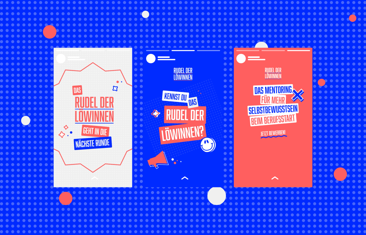 Für das Rudel der Löwinnen haben wir nicht nur die visuelle Identität entwickelt, sondern sind seit Projektstart auch für sämtliche Werbemassnahmen der jährlichen Mentoring-Kampagnen zuständig. Dies beinhaltet neben klassischen Werbemitteln wie Poster und Flyer auch passenden Content für Social Media wie animierte Videos, Gifs und visuell ansprechende Carousel-Ads.